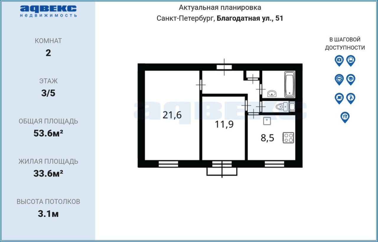 Жилая площадь 33.6 кв.м. Число комнат 2