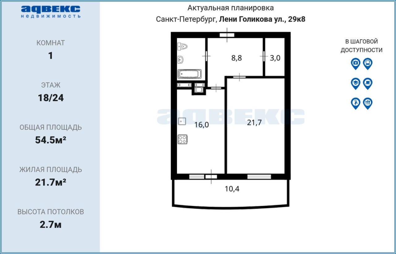 | Этаж | 18 | Общая площадь | 54.5 кв.м. |