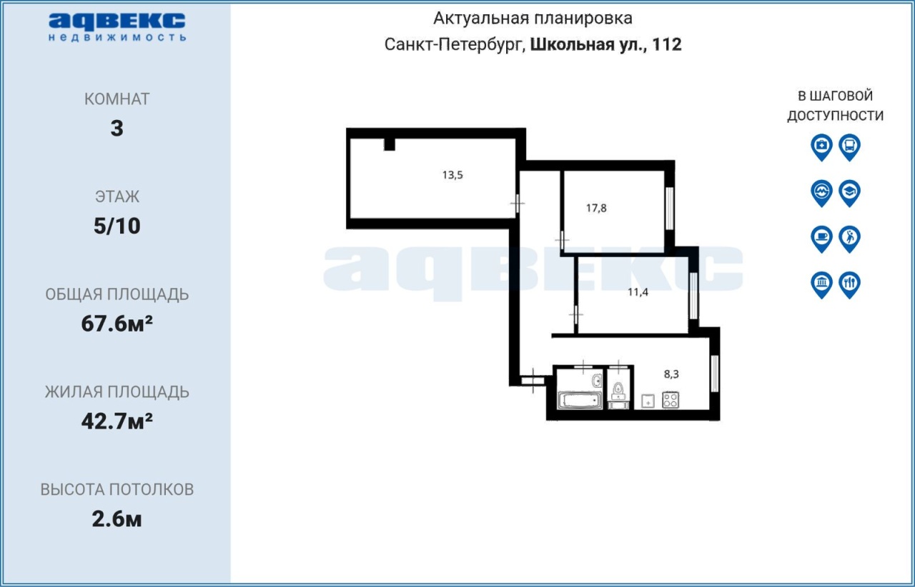 | Этаж | 5 | Общая площадь | 67.6 кв.м. |