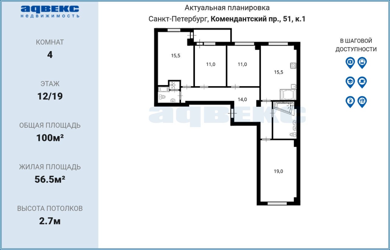 | Этаж | 12 | Общая площадь | 100 кв.м. |