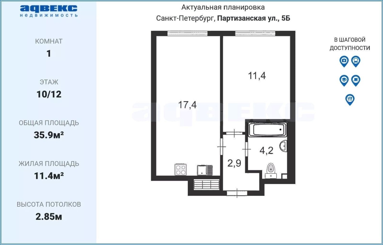 | Этаж | 10 | Общая площадь | 35.9 кв.м. |