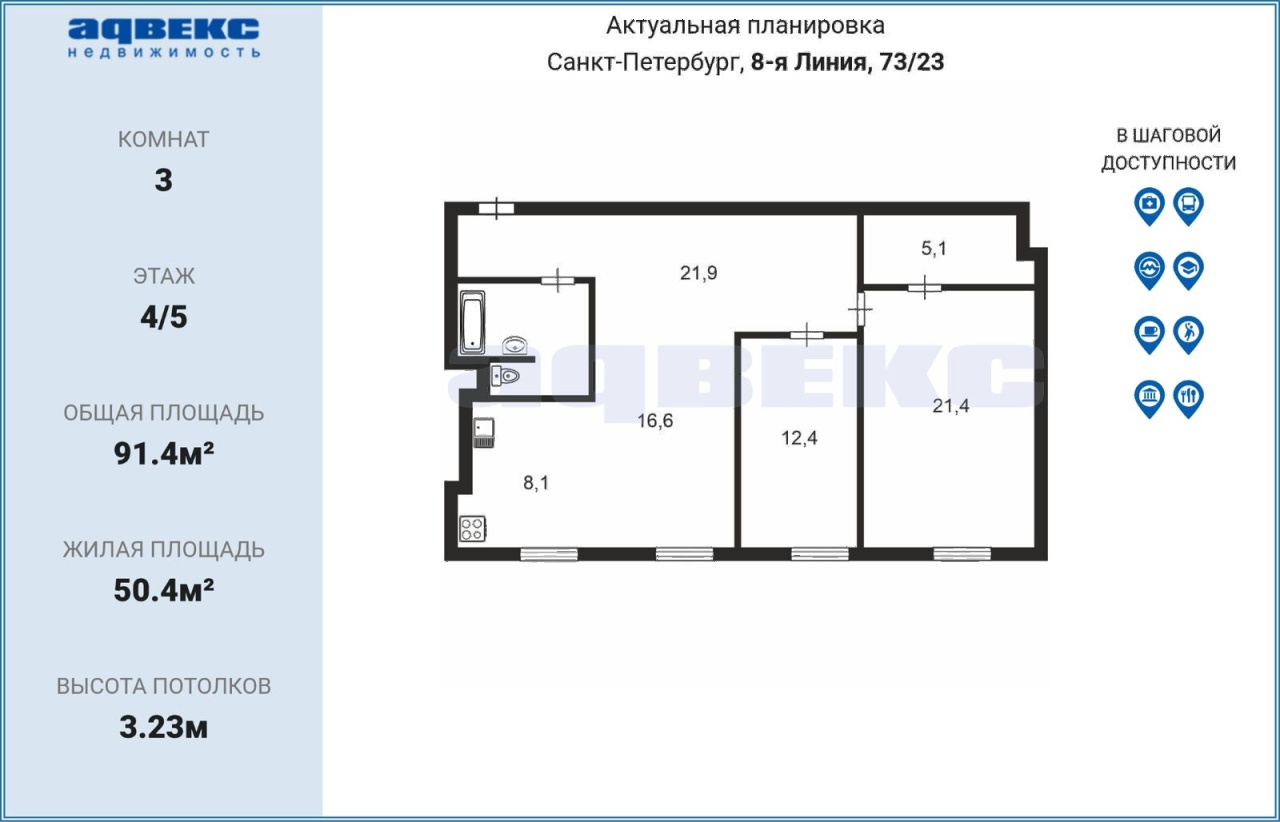 | Этаж | 4 | Общая площадь | 91.4 кв.м. |