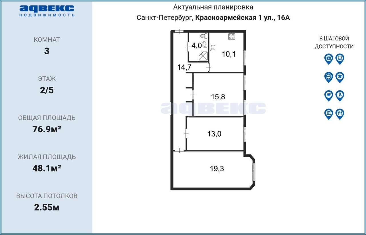 - Три полноценные изолированные комнаты 19.3 (с эркером), 15.8 и 13.0 кв. м, все помещения правильной квадратной формы, не вытянутые