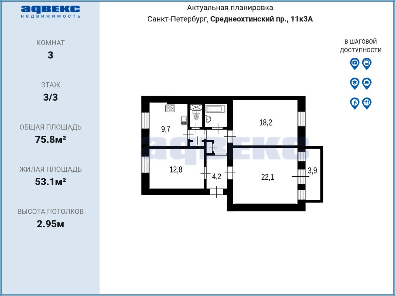 Жилая площадь 53.1 кв.м. Число комнат 3