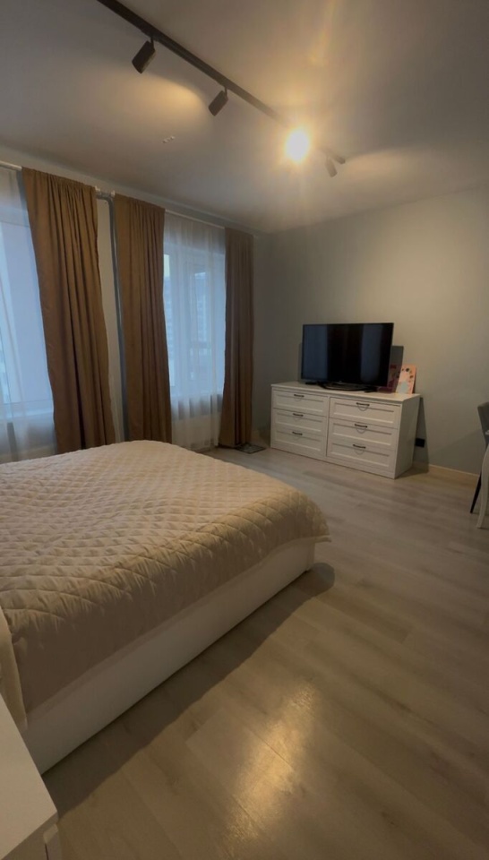 Окна выходят на две стороны (на проспект на малоэтажные Резиденции и во двор).