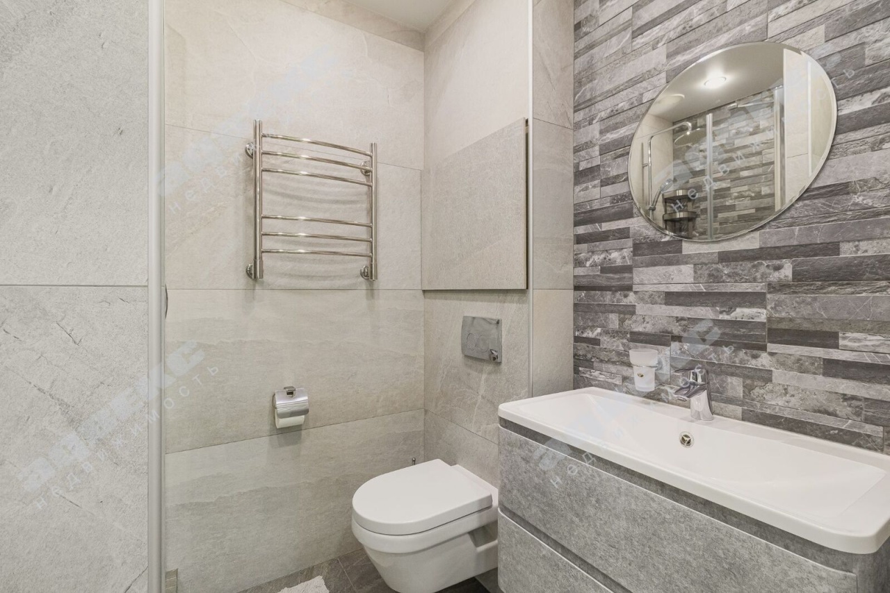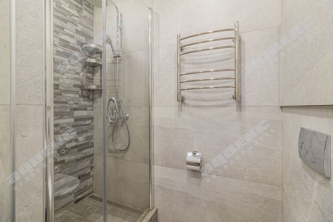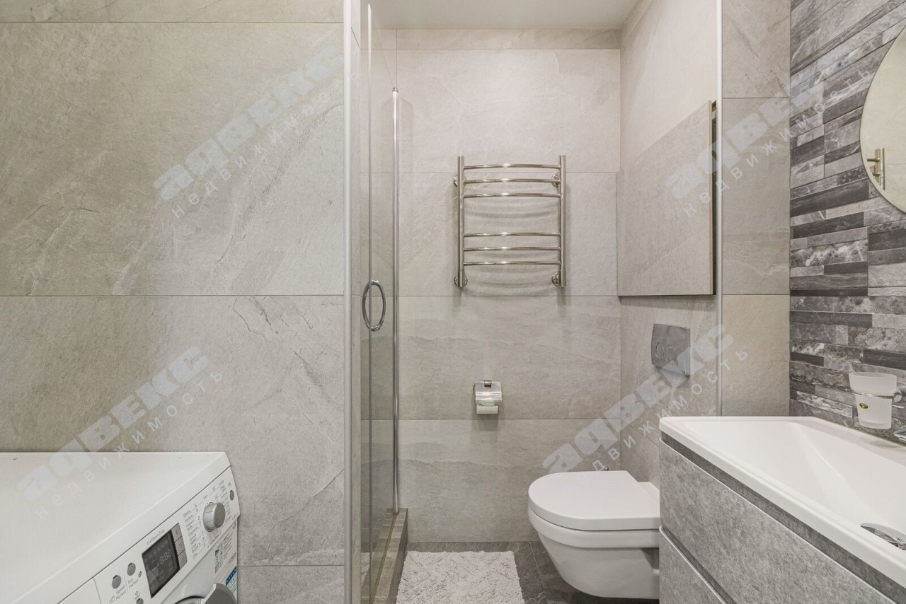 - В совмещенном санузле полы с подогревом, встроенная душевая кабина, современное сантехническое оборудование, стиральная машина.