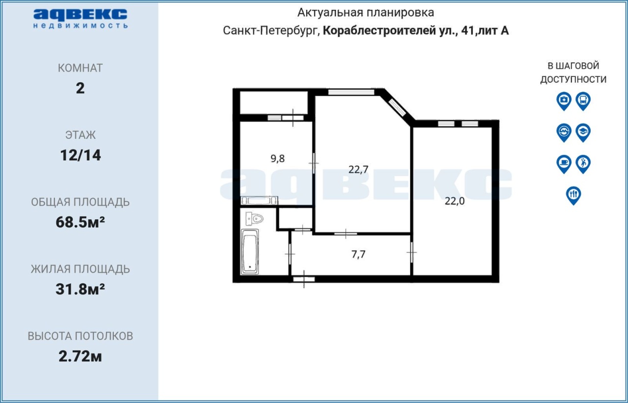 | Этаж | 12 | Общая площадь | 68.5 кв.м. |