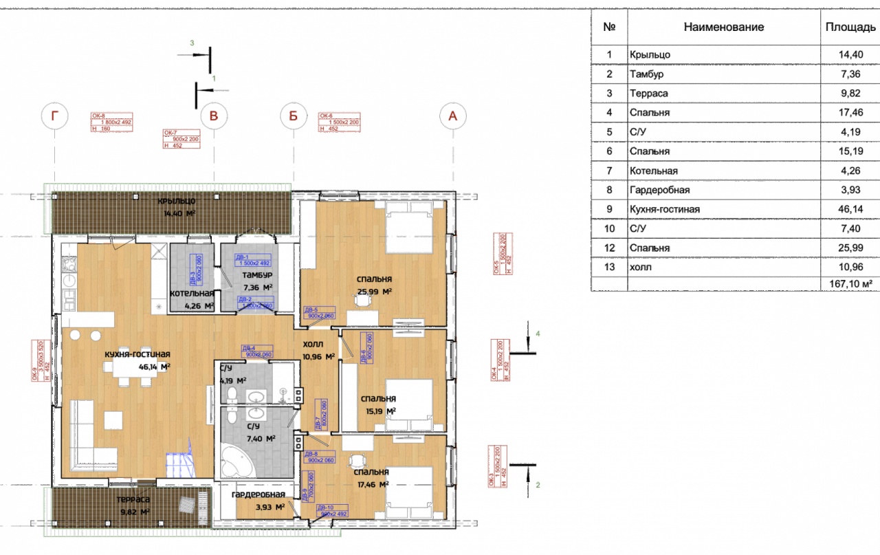 Первый этаж большая кухня-гостиная с панорамным остеклением 46.14 кв. м., вторым светом и выходом на террасу 9.82 кв. м., три спальни 25.99 кв. м. + 15.19 кв. м. + 17.46 кв. м. с гардеробной 3.93 кв. м., два санузла 7.40 кв. м. и 4.19 кв. м., большой вместительный холл 10.96 кв. м., котельная 4.26 кв. м., постирочная.