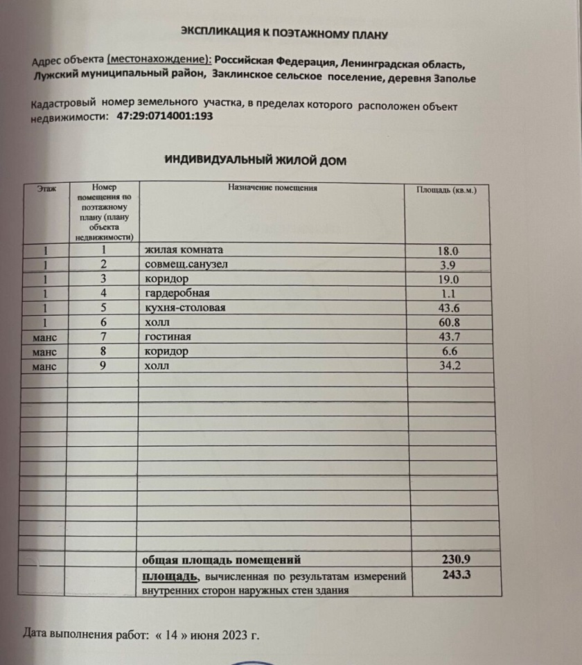 Общая площадь по наружн. обмеру 243.3 (внутренняя общ. площ. 230.9)