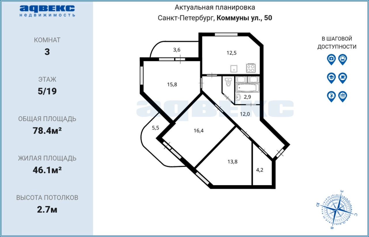 Жилая площадь 46.1 кв.м. Число комнат 3