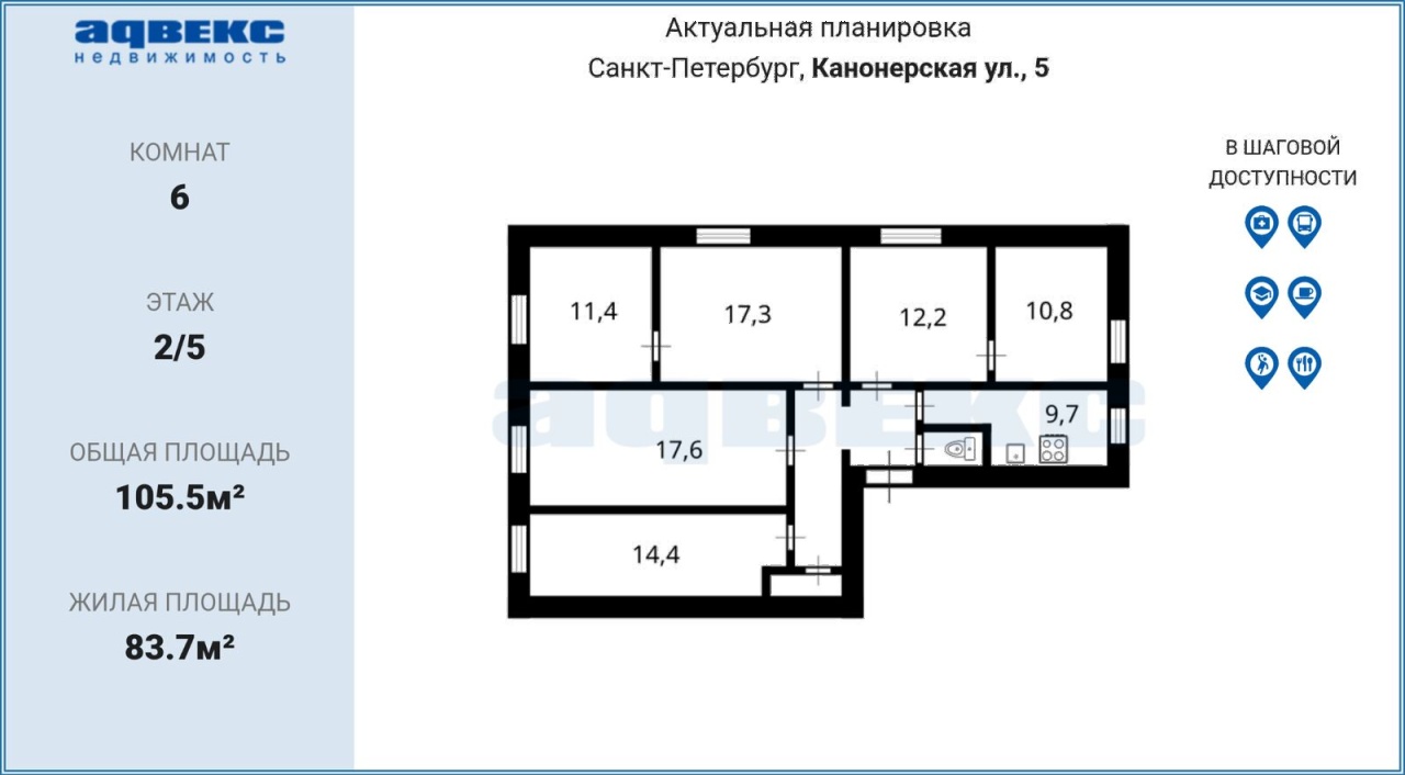 | Жилая площадь | 83.7 кв.м. | Число комнат | 6 |