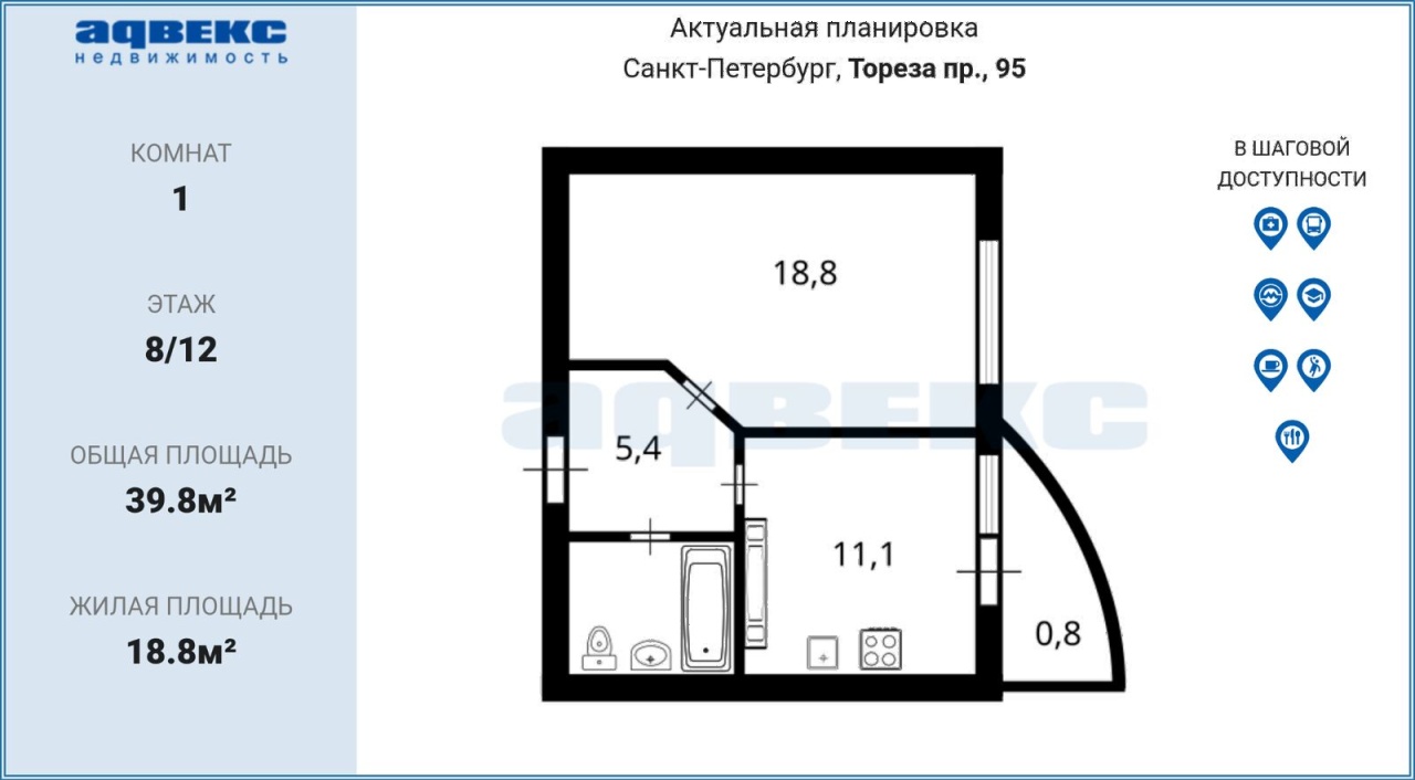 | Этаж | 8 | Общая площадь | 39.8 кв.м. |
