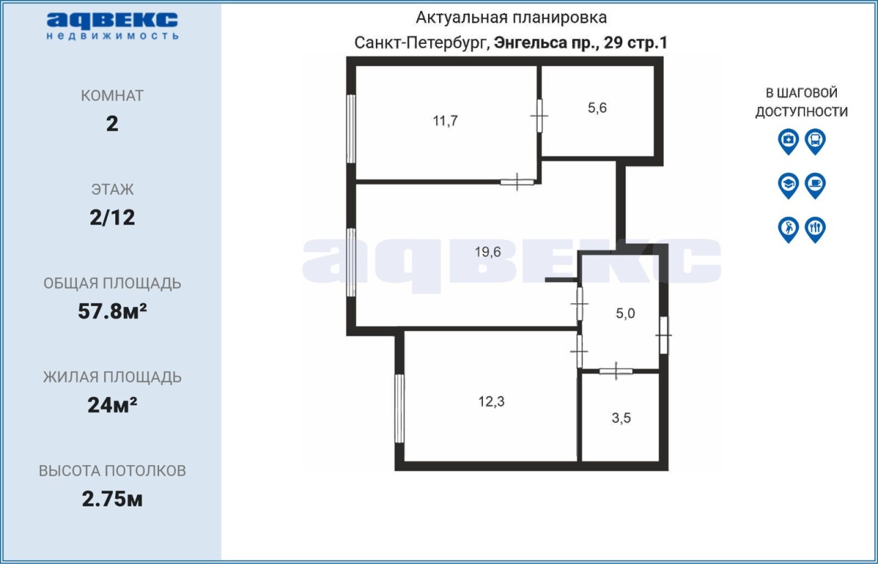 | Этаж | 2 | Общая площадь | 57.8 кв.м. |