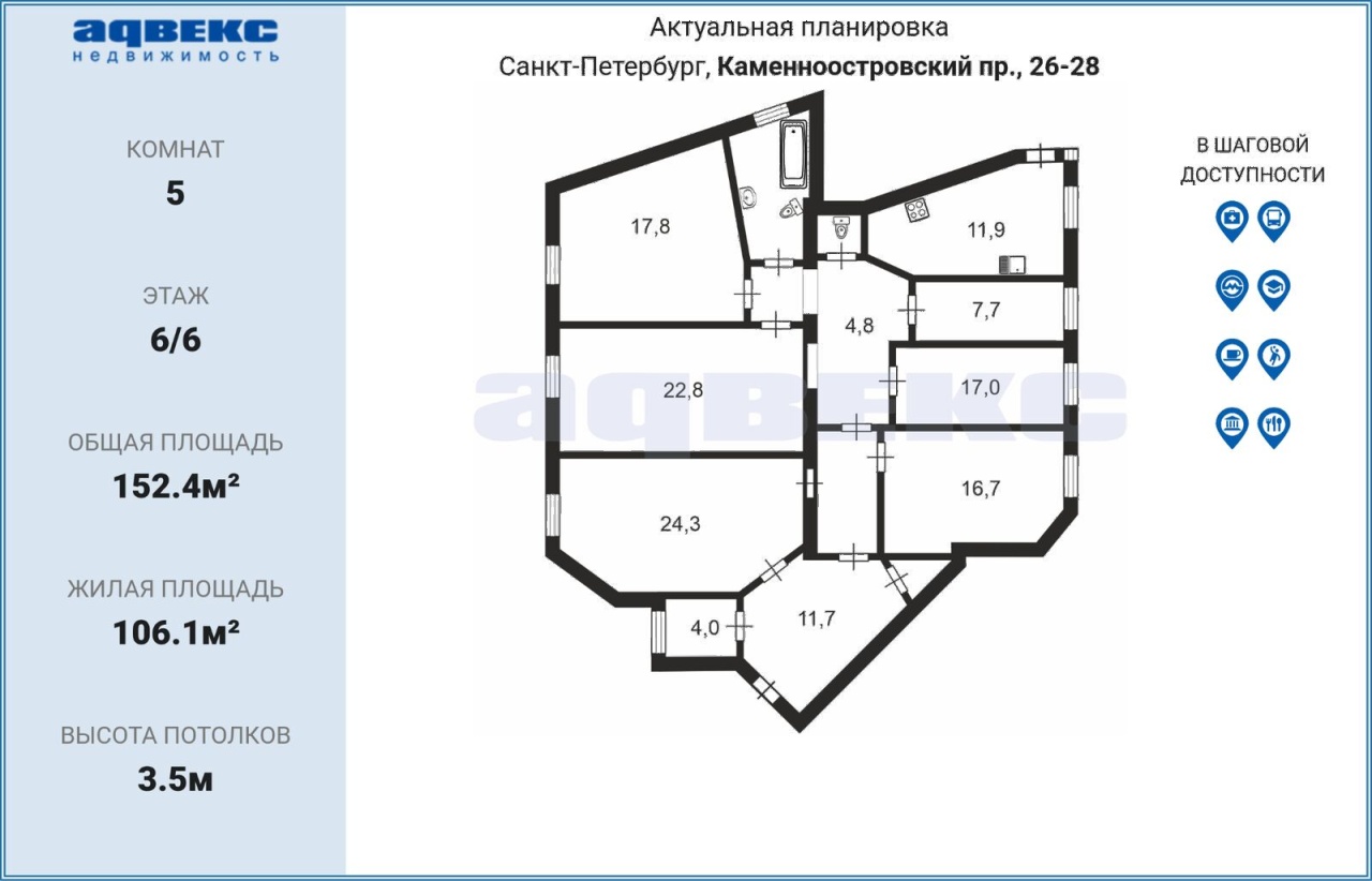 | Этаж | 6 | Общая площадь | 152.4 кв.м. |
