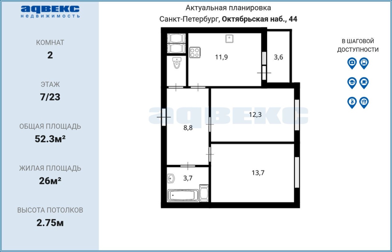 Этаж 7 Общая площадь 52.3 кв.м.