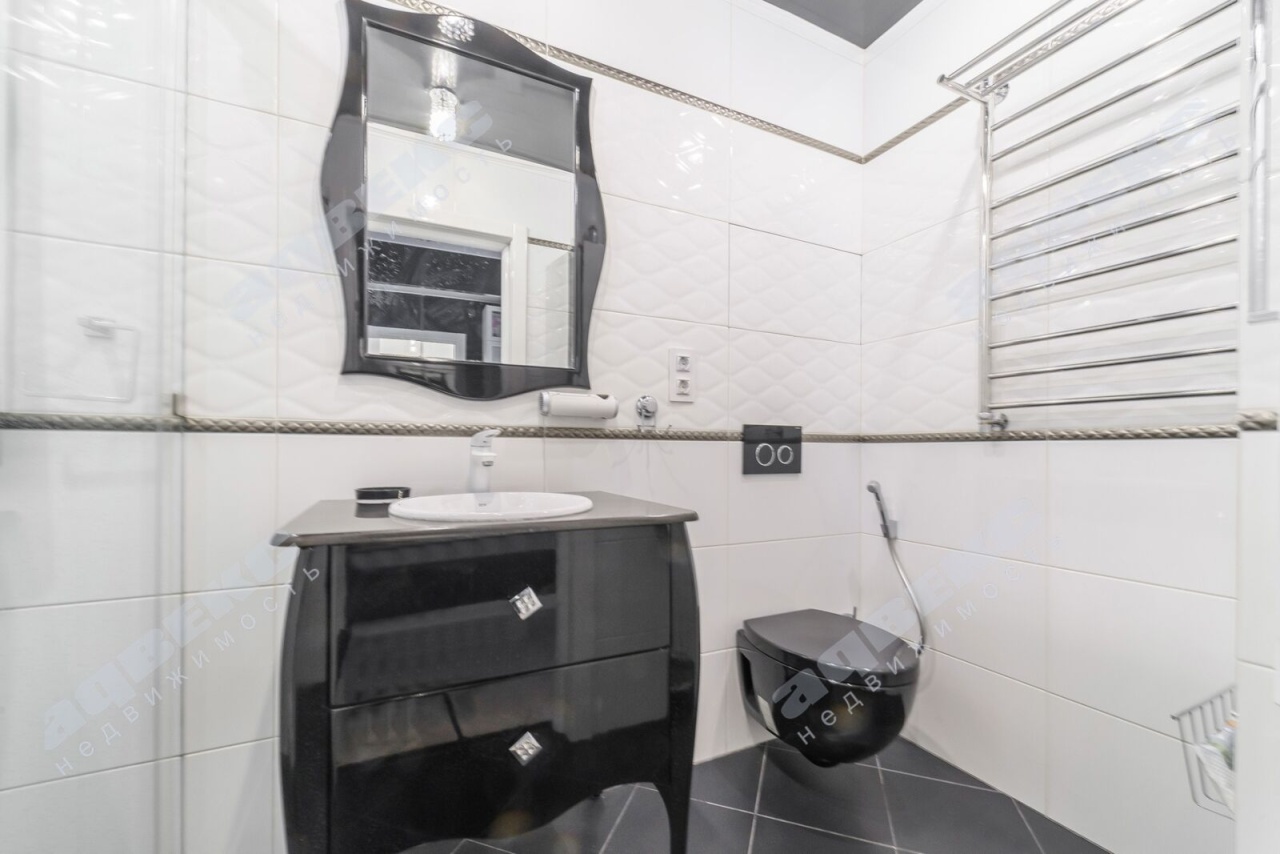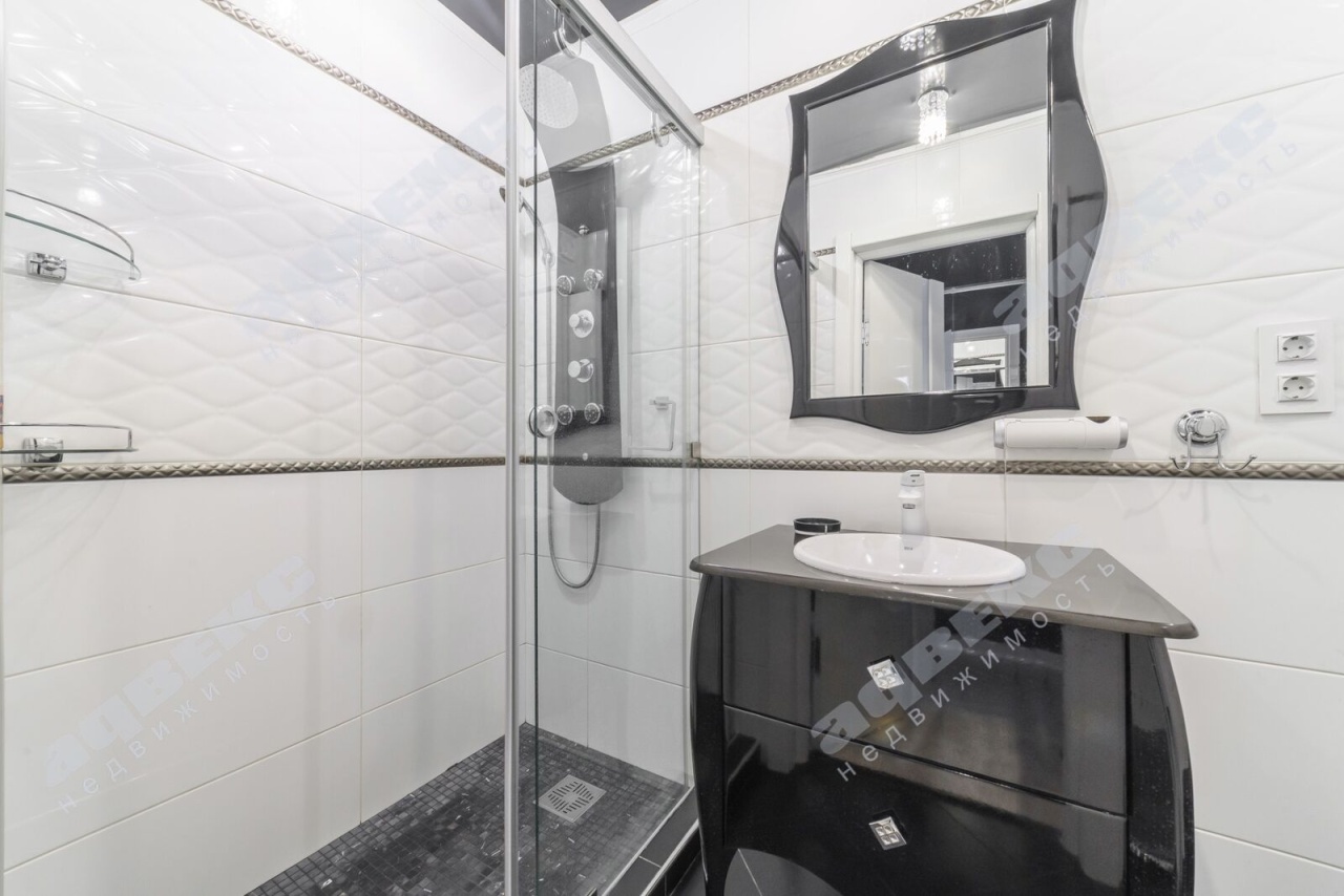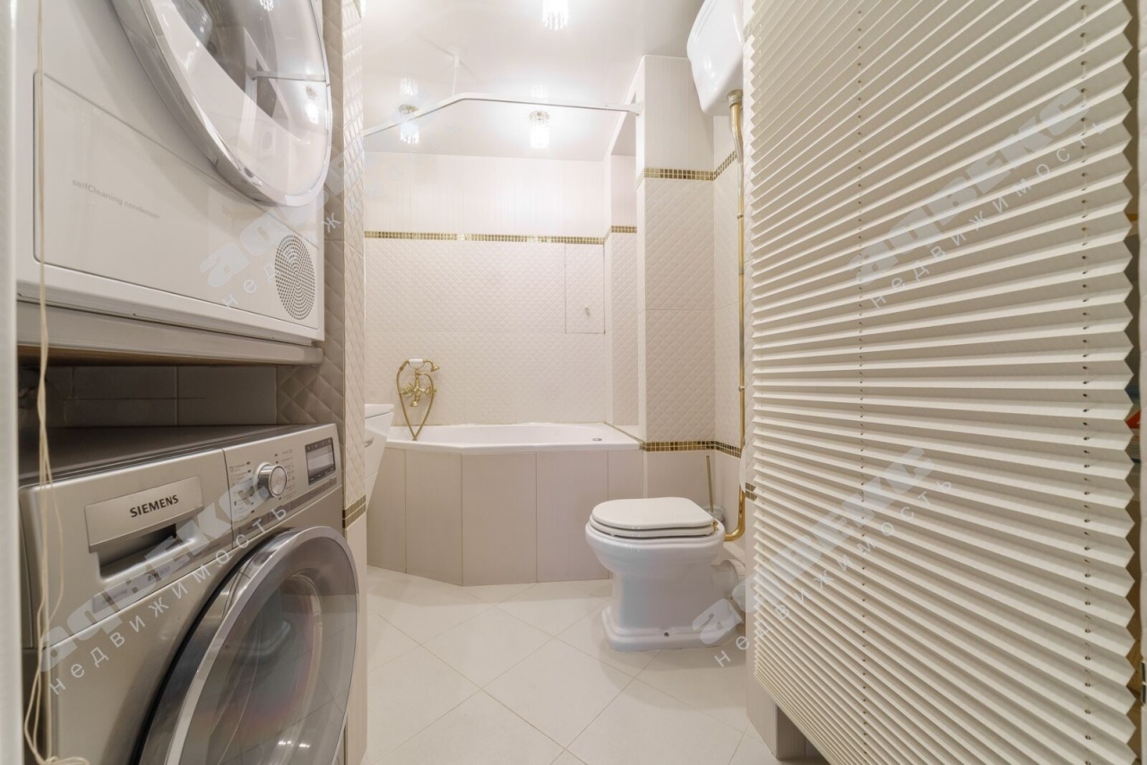 2 больших санузла: 3.8 кв. м -с душевой кабиной; во втором санузле (4.3 кв. м) находится ванная, стиральная и сушильная машинки (Siemens).