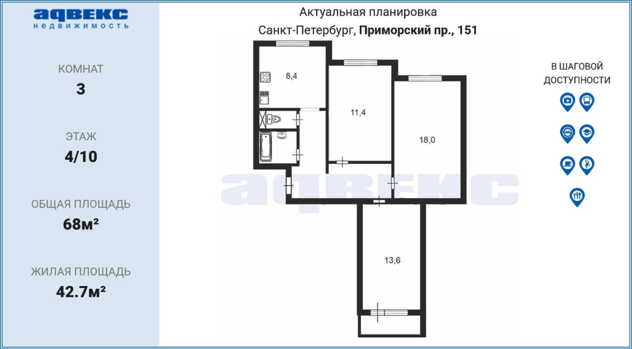 | Этаж | 4 | Общая площадь | 68 кв.м. |