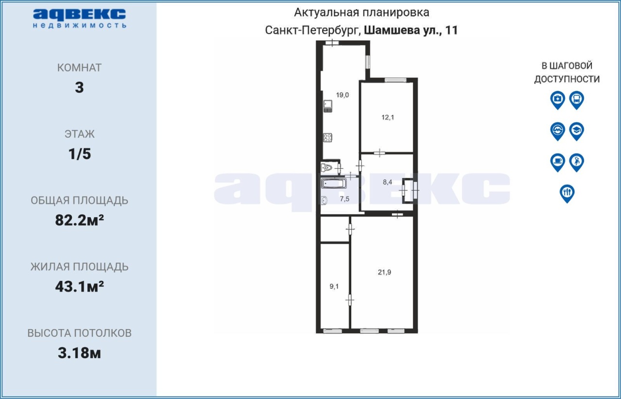 | Этаж | 1 | Общая площадь | 82.2 кв.м. |