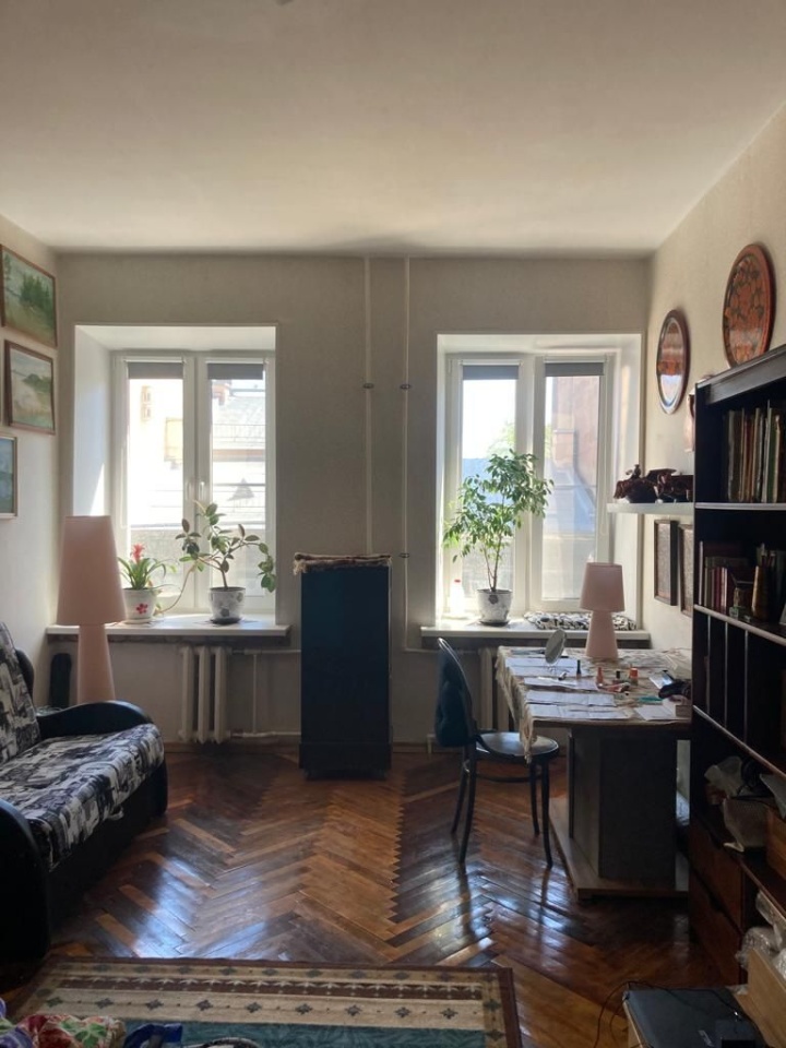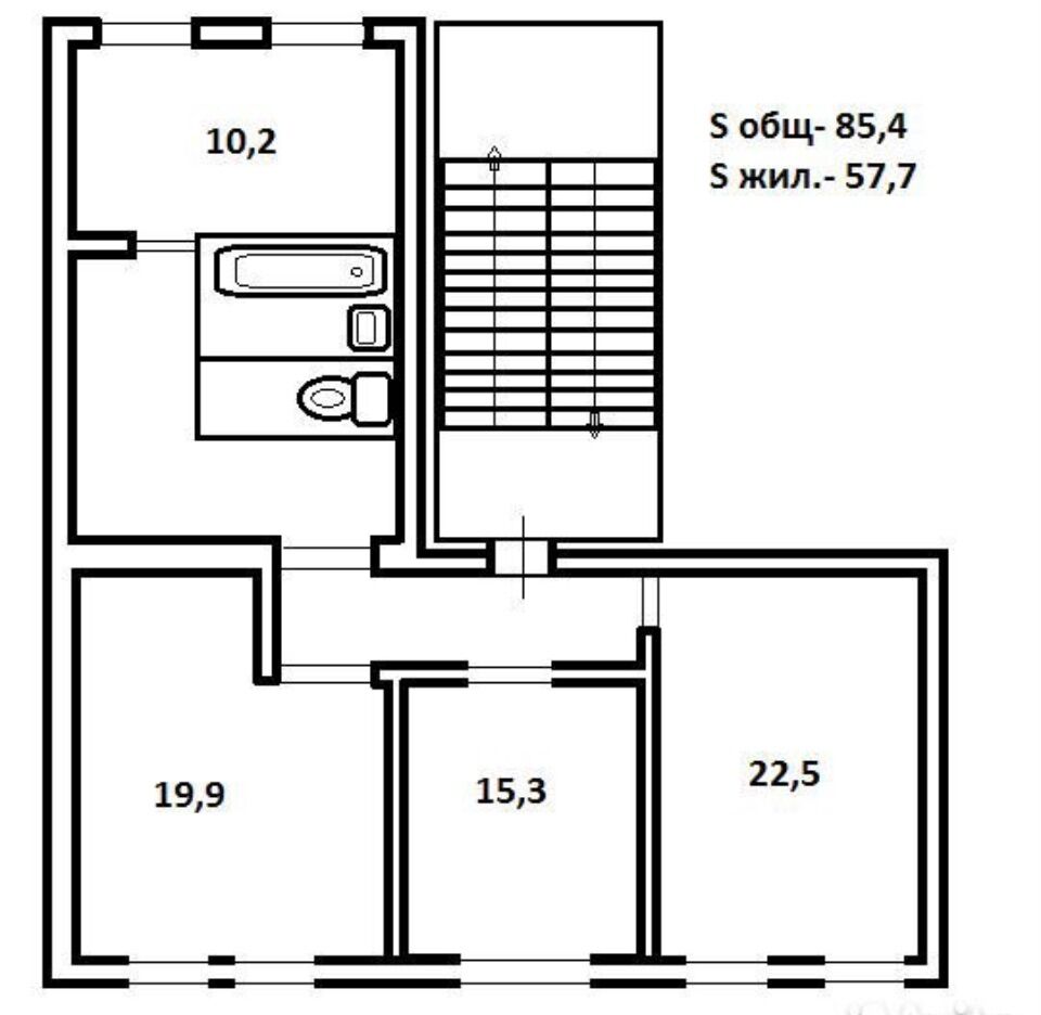 Площадь квартиры 85.4 кв. м, кухня 10.2, комнаты 22.5 + 15.3 + 19.9, туалет, ванна - раздельные, большой коридор. Квартира очень светлая, уютная, просторная, окна на две стороны, из окон прекрасный вид. Окна- стеклопакеты, новые, дверь металлическая -новая, паркет сохранен и обновлен.
