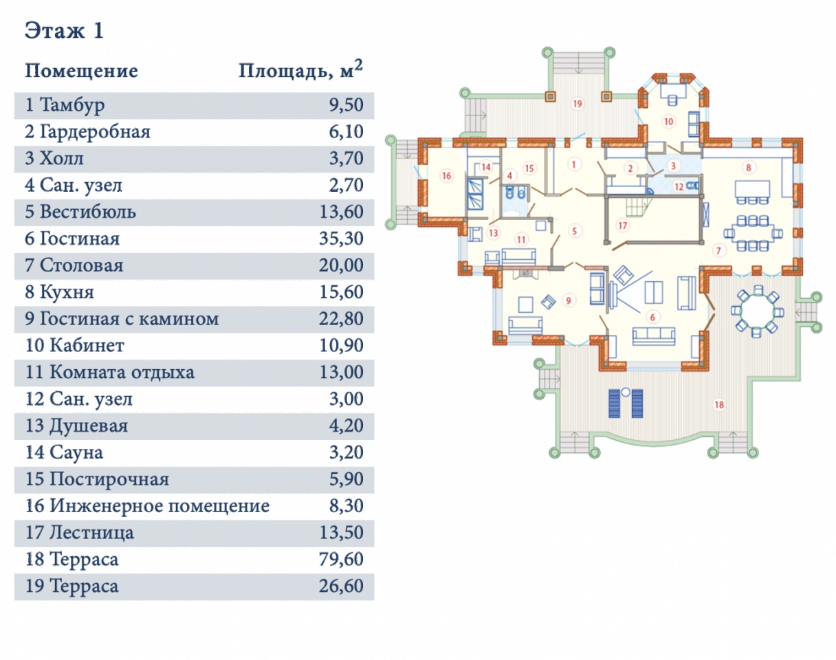 Резиденция расположена на земельном участке площадью 53.25 кв. м.