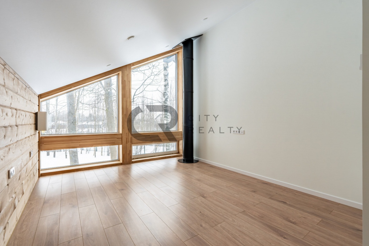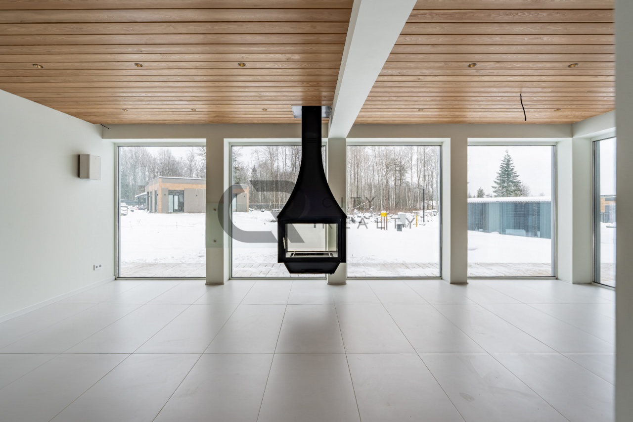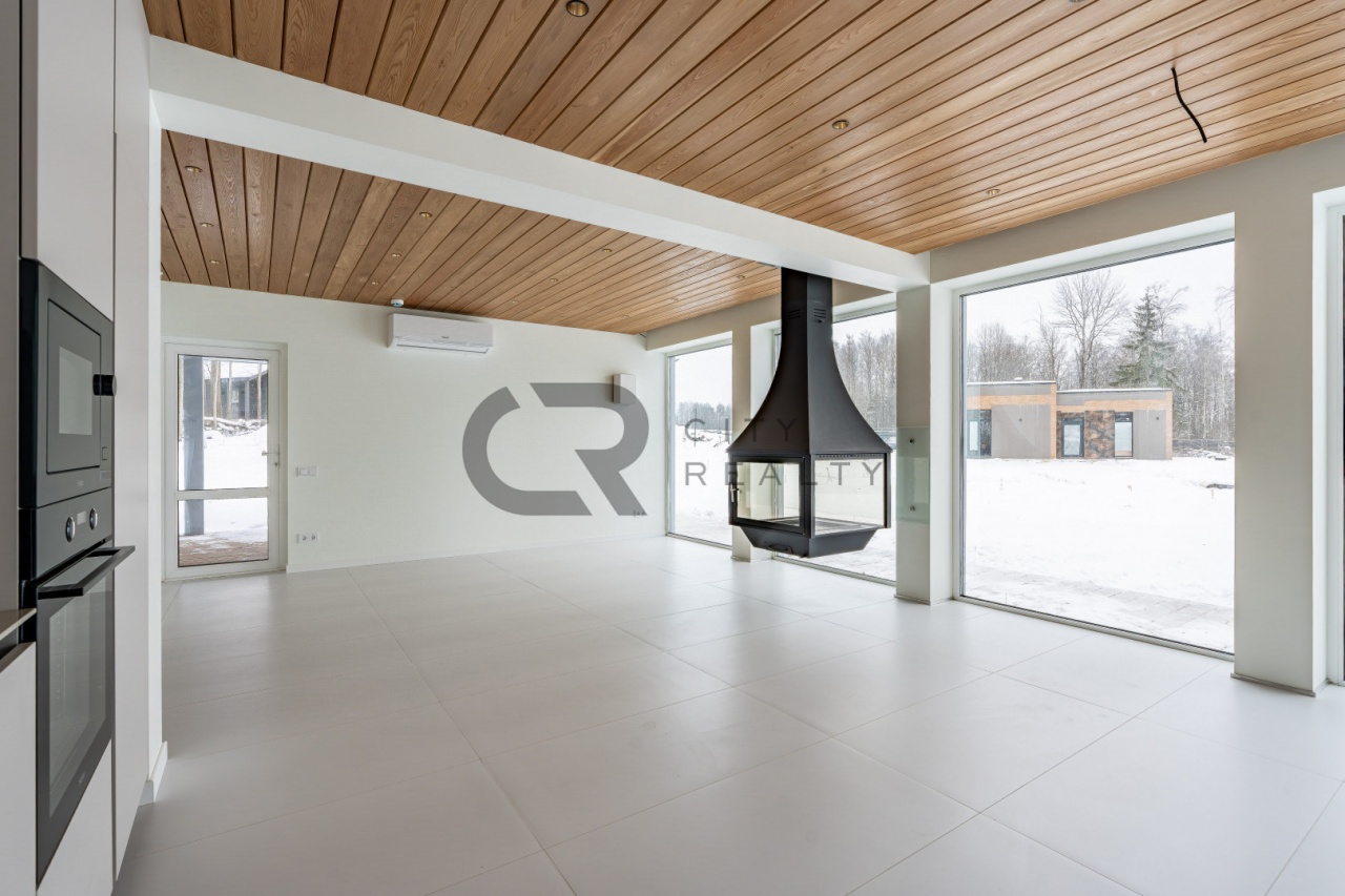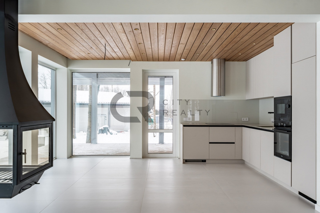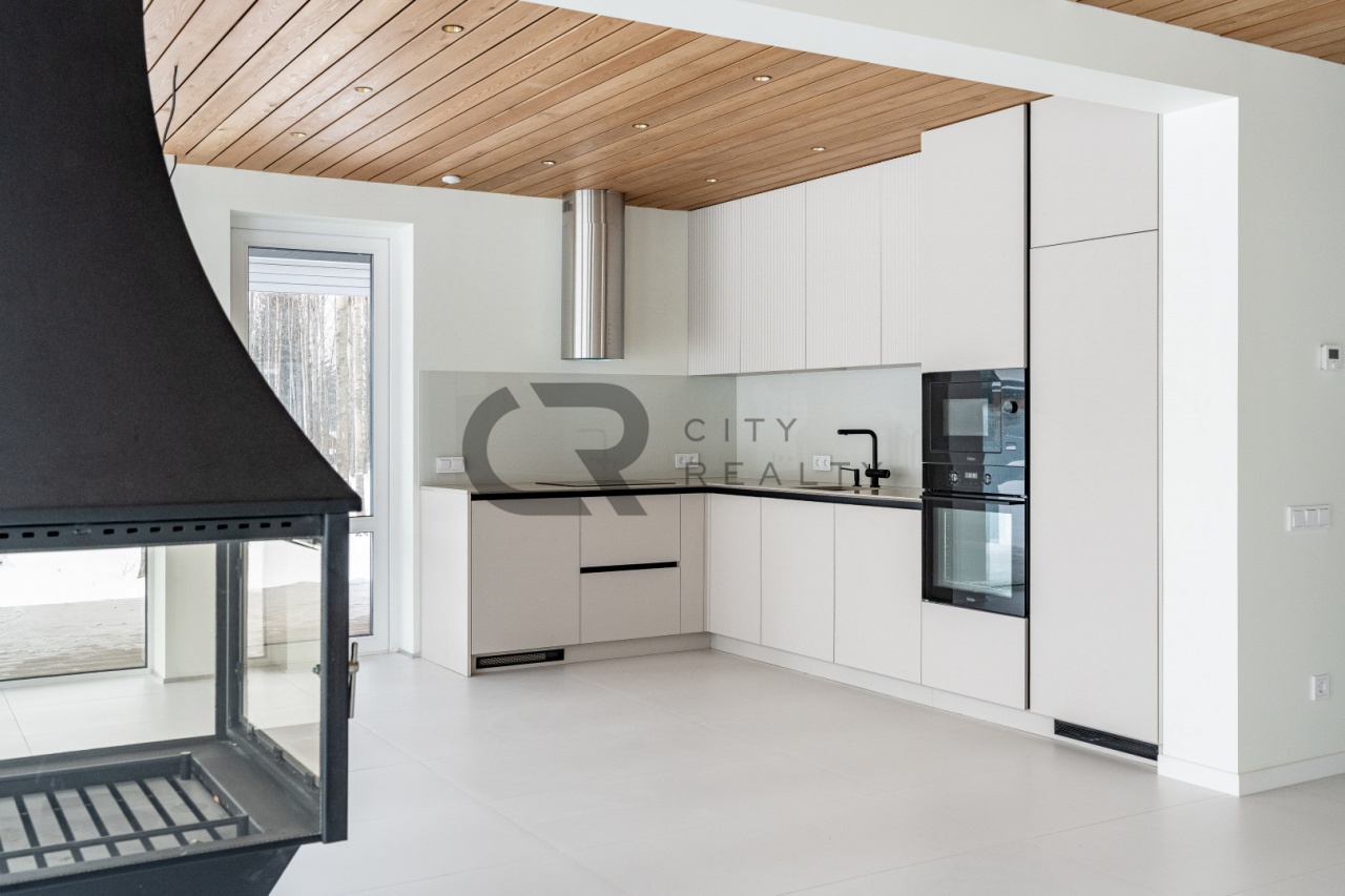 В гостиной установлен камин, который создаёт уютную атмосферу и дополнительный источник тепла. Кухня оснащена мебелью и всей необходимой бытовой техникой.