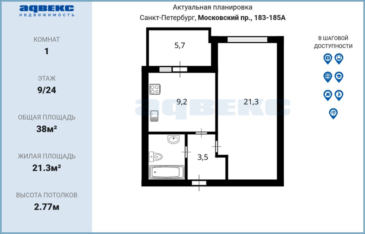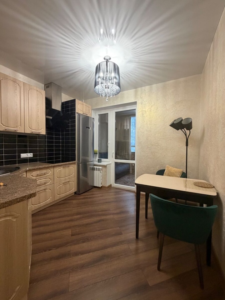Площадь квартиры составляет 38 квадратных метров + утепленная лоджия около 4 кв. м. Просторная комната 21.3 кв. м, окна выходят во двор, что обеспечивает тишину и приватность. Кухня 9.2 кв. м оснащена мебелью, включая посудомоечную машину. Высота потолков в квартире составляет 2.77 метра.