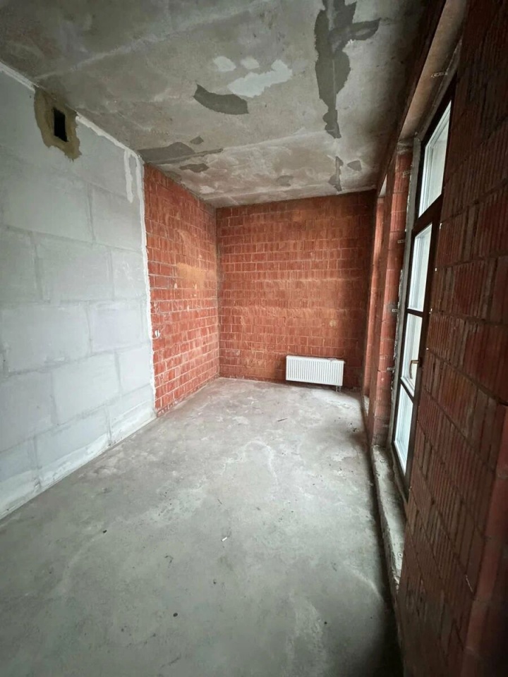 Квартира без отделки. В помещении несколько санузлов, также имеется балкон. Окна выходят как на улицу, так и во внутренний двор.