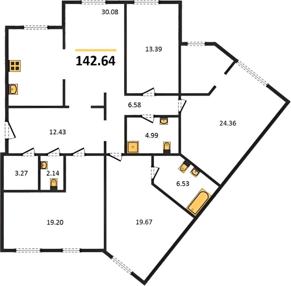 Общая площадь квартиры составляет 142 квадратных метра. В планировке предусмотрены четыре комнаты с размерами 24, 20, 19 и 14 квадратных метров, а также кухня площадью 30 квадратных метра, которая объединена с гостиной зоной.