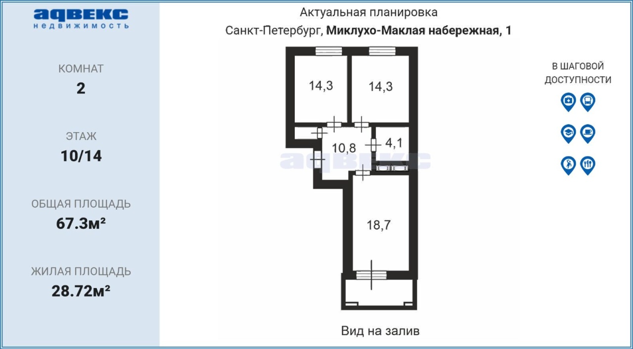 | Этаж | 10 | Общая площадь | 67.3 кв.м. |