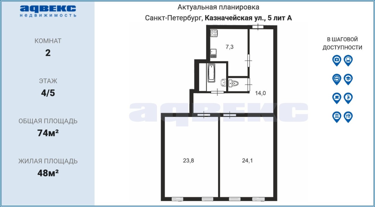 Тихая и известная улица Казначейская, на которую выходят 4 больших окна квартиры. - улица известная в культурной среде. На Казначейской в разных домах жил писатель Достоевский. За углом жили его герои, а также писатель Гоголь). В этом уголке Петербурга каждый дом дышит историей. Наш дом - НЕ памятник. А это значит, что ремонт в квартире не потребует дополнительных согласований.