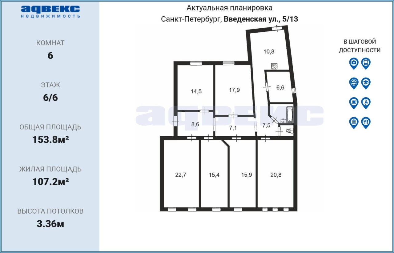 | Этаж | 6 | Общая площадь | 153.8 кв.м. |