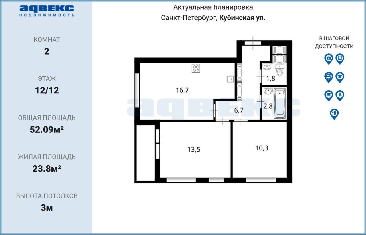 Этаж 12 Общая площадь 53 кв.м.