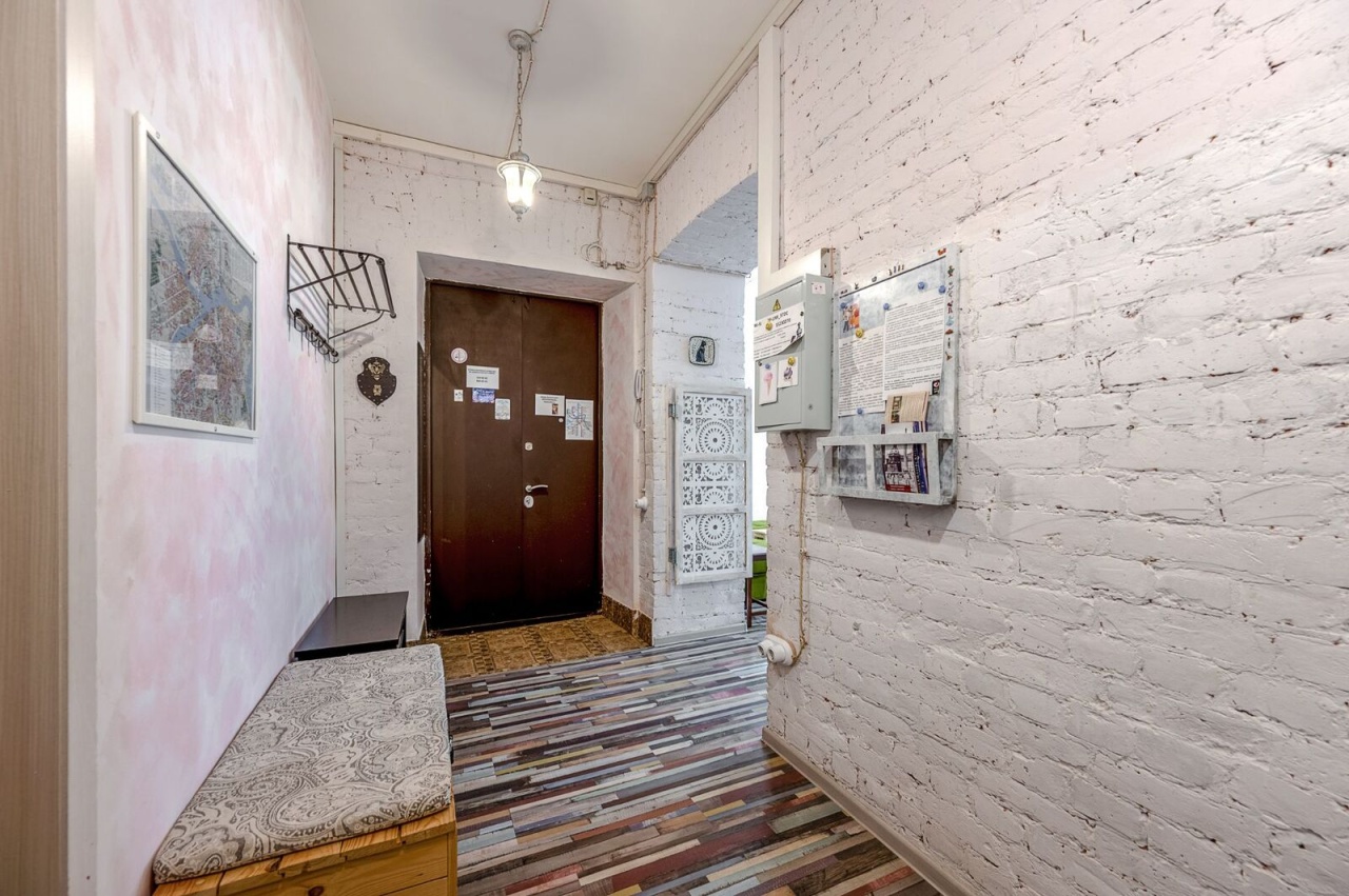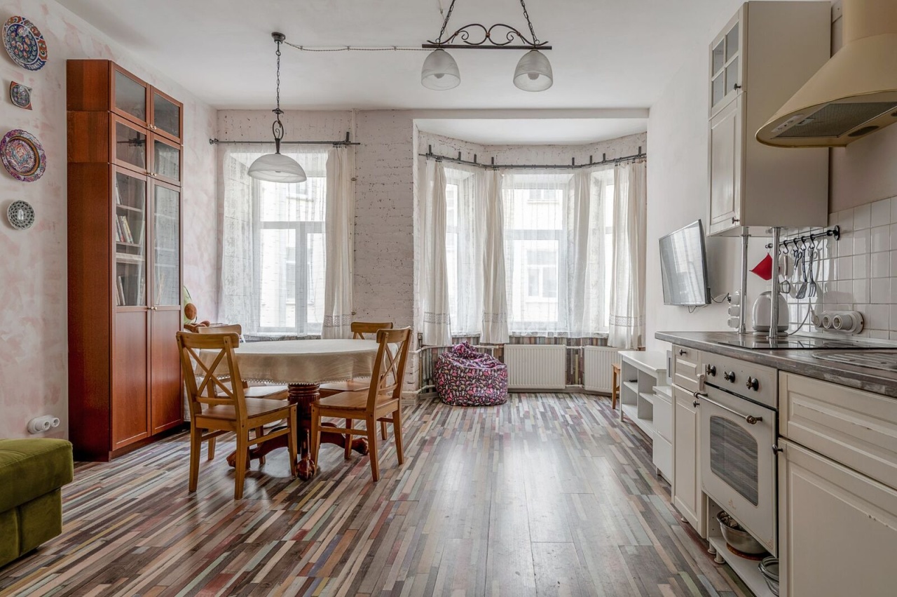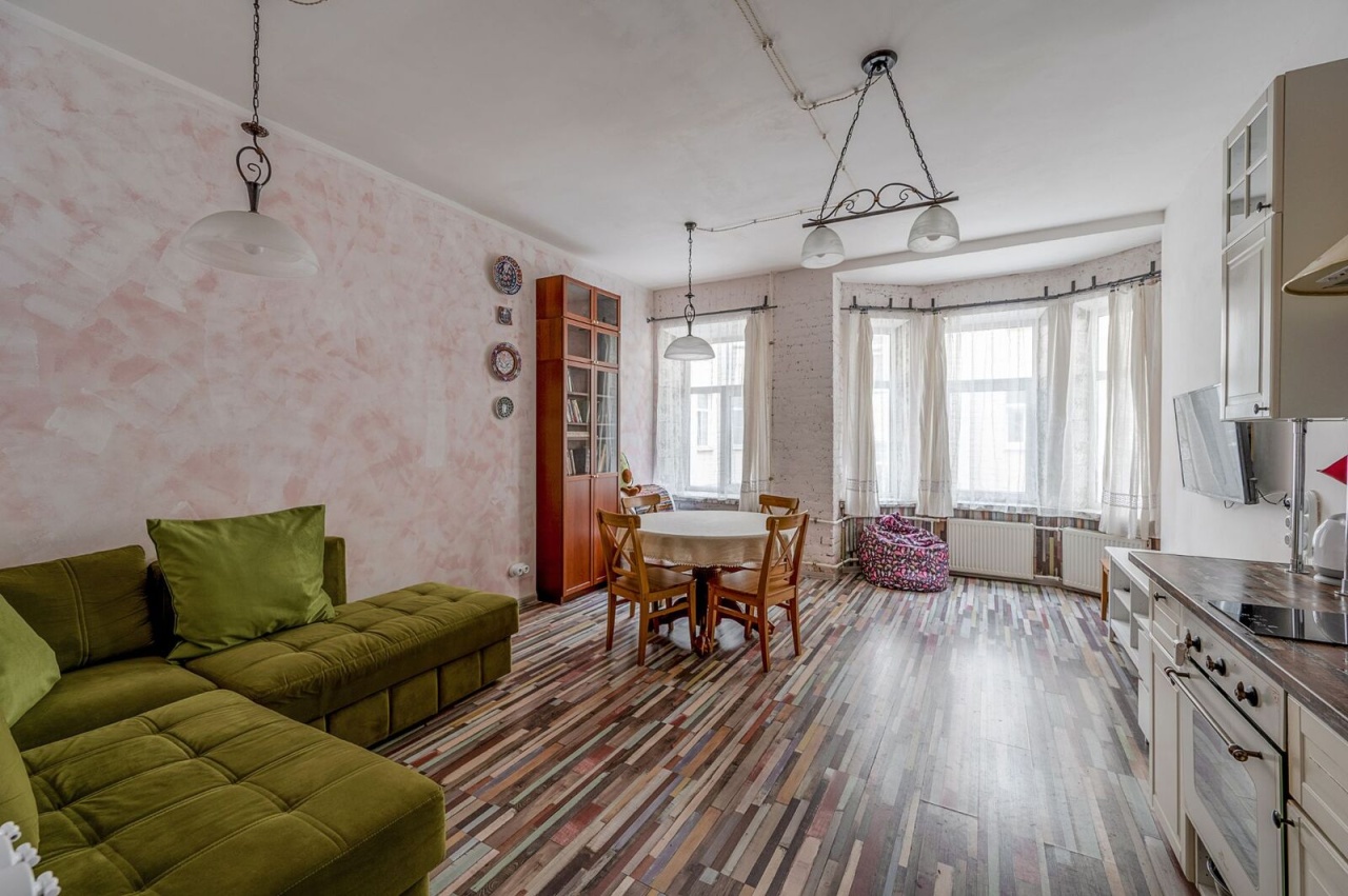 Квартира находится на втором этаже пятиэтажного кирпичного дома, построенного в 1911 году. Высота потолков составляет 3.13 метра, в квартире выполнен качественный евроремонт. Планировка включает четыре комнаты площадью 25, 16, 10.5 и 24.5 кв. м, а также кухню площадью 12 кв. м. Санузлы раздельные. Окна квартиры выходят во двор, поэтому тихо, не слышно уличного шума. Квартира оборудована газовой плитой, остается мебель в комнатах и на кухне.