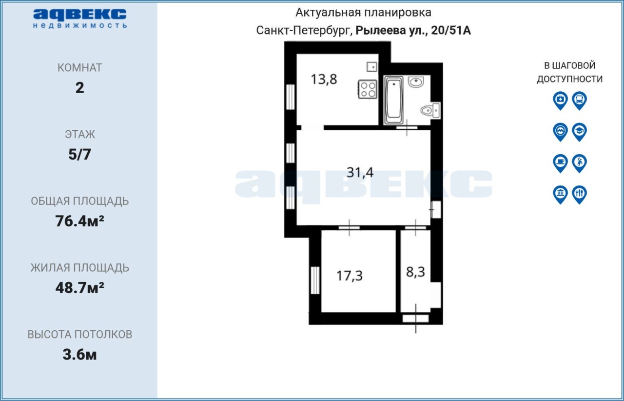 | Этаж | 5 | Общая площадь | 76.4 кв.м. |