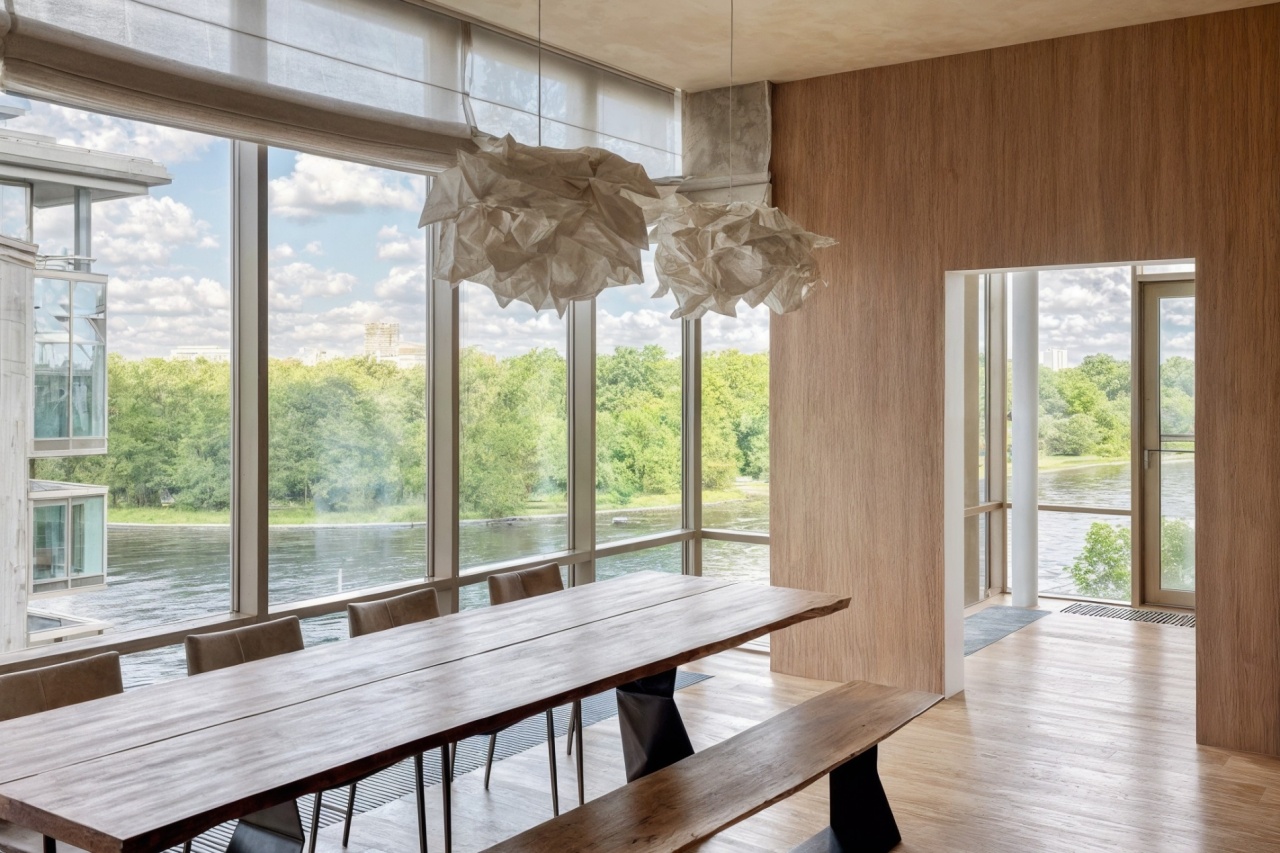 Квартира объединена из двух лотов площадью 127 и 192 м², благодаря чему создано гармоничное пространство для семейной жизни. Панорамные окна открывают виды на Среднюю Невку и зелень Елагина острова. Из окон спален видны Лахта Центр и флаги России, СССР и Российской Империи.