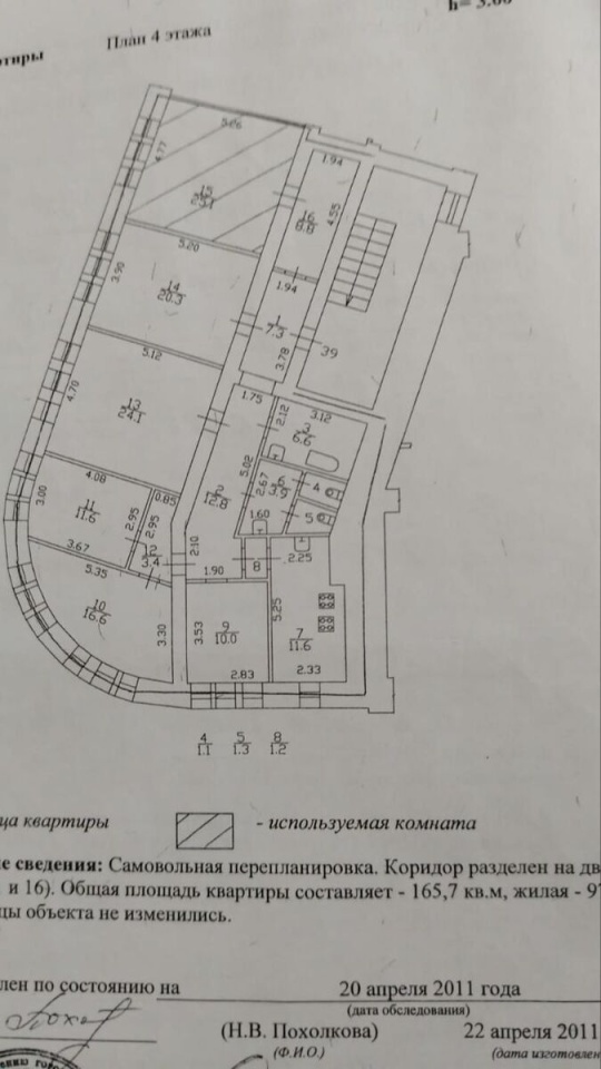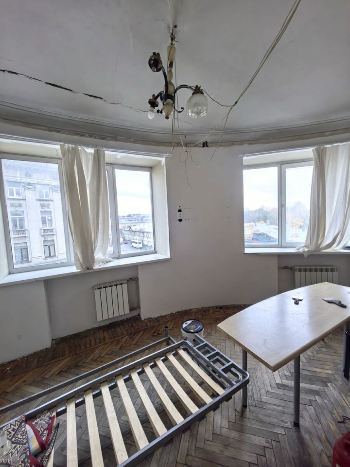 Общая площадь квартиры составляет 165.7 квадратных метров. Жилая площадь распределена между пятью комнатами с площадями 25, 24, 20, 17 и 12 квадратных метров соответственно. Кухня занимает 11.6 квадратных метра. Квартира расположена на четвертом этаже пятиэтажного дома. Жилье требует проведения ремонта и предлагается без отделки, в планировке предусмотрено несколько санузлов. Окна обращены на улицу, из которых открывается вид на парк.