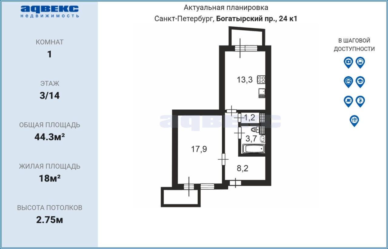 | Этаж | 3 | Общая площадь | 44.3 кв.м. |