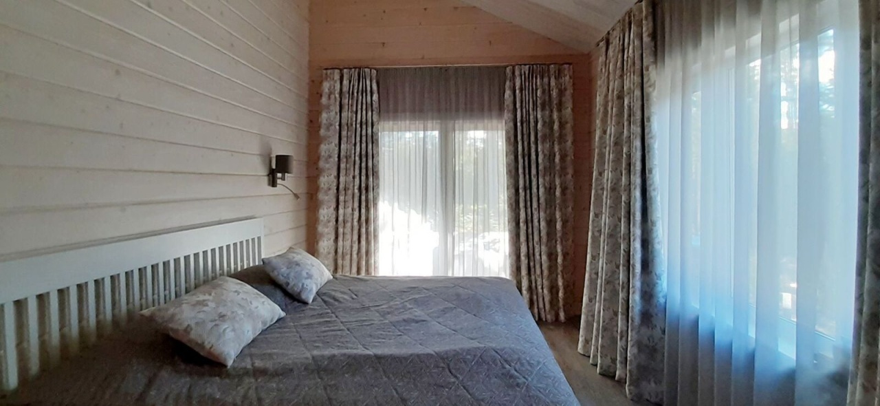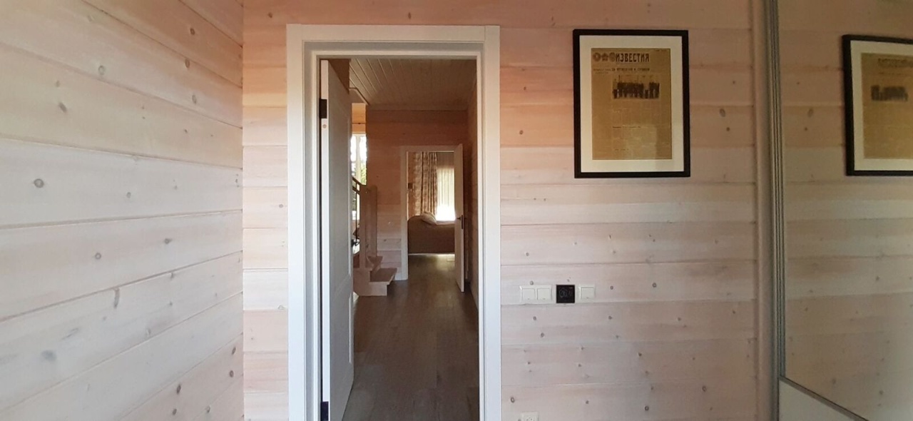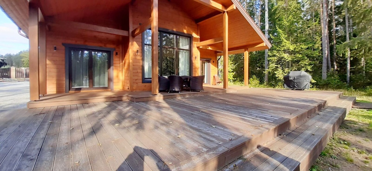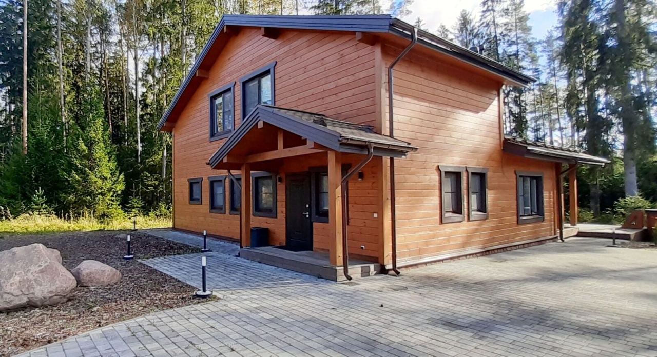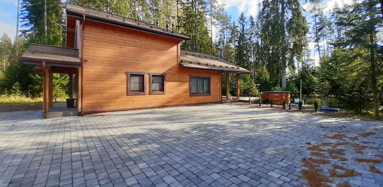натуральный канадский кедр. Фундамент - монолитная железобетонная плита. Кровля - мягкая черепица. Дом 2-этажный. На 1 этаже расположены большая гостиная и кухня-столовая со вторым светом, две спальни, санузел, душ, сауна, холл, прихожая, котельная; на 2 этаже - две просторные комнаты, гардеробная, санузел с душем. Есть крыльцо, большая терраса площадью 35 кв. м. Оборудована премиальная уличная купель с джакузи (GOODWOOD).