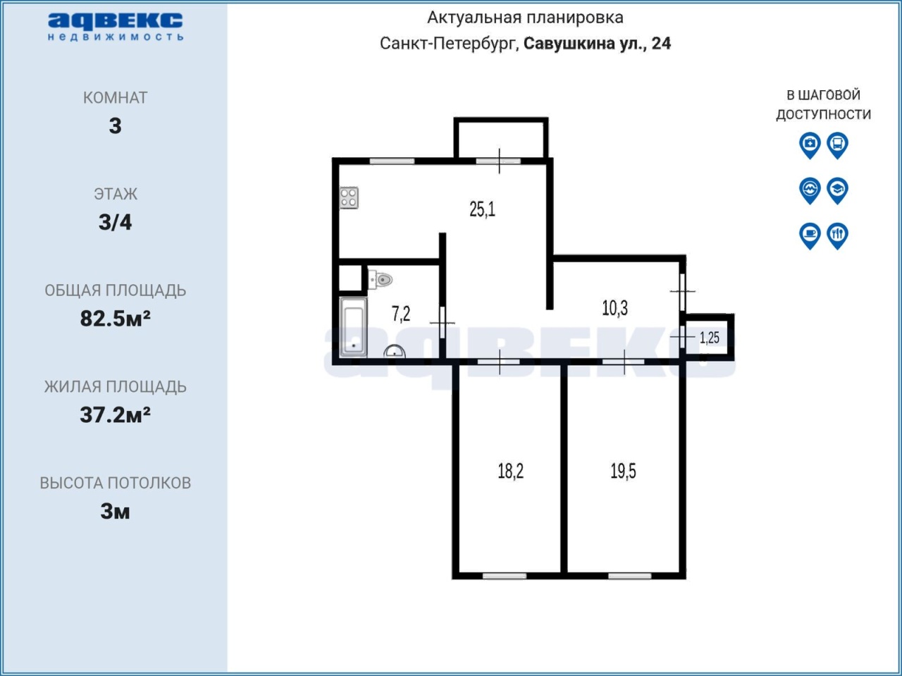 | Этаж | 3 | Общая площадь | 82.5 кв.м. |