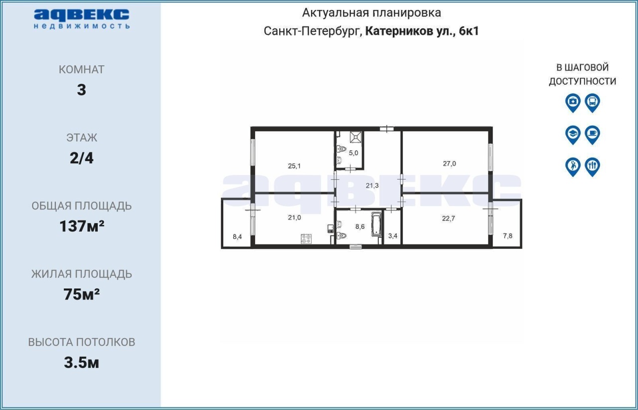 | Жилая площадь | 75 кв.м. | Число комнат | 3 |