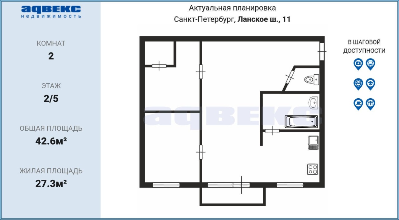 | Этаж | 2 | Общая площадь | 42.6 кв.м. |