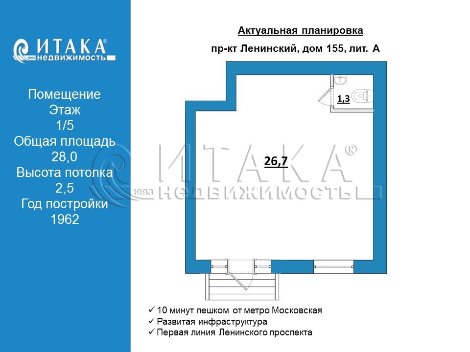 7-28273 В прямой продаже нежилое помещение 28 кв. м. на первой линии Ленинского проспекта. 10 минут пешком от метро Московская. Хорошая проходимость: по пути два бизнес-центра. Помещение после ремонта, расположено на первом этаже жилого дома. Отдельный вход с крыльцом, два окна. Электричество 15 кВт, счетчики на воду и электричество, установлены водяные фильтры. Отдельный санузел и подсобное помещение. Холодная вода, есть место для установки бойлера. Высота потолков 2.5 м. Рольставни на окнах, зонированное освещение, вывеска с подсветкой. Идеально для кафе, аптеки, офиса, салона красоты, торговой площади, бытовых услуг. Прямая продажа, один взрослый собственник лично присутствует на сделке. Обремений нет.
